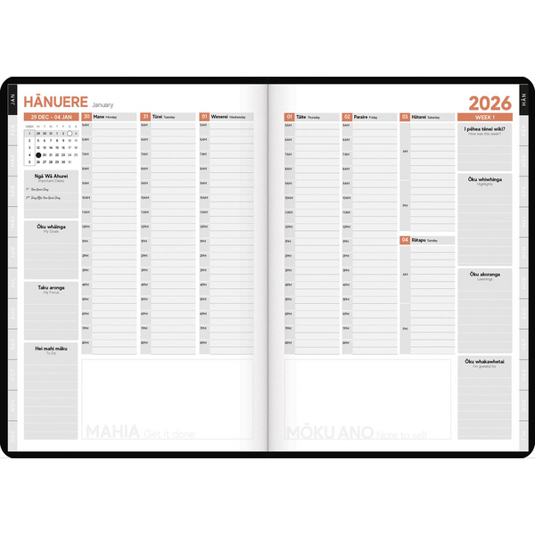 This Tuhi A43 Bilingual Diary has a week to view Mahere wiki layout. This layout is ideal for those who need to have an at-a-glance view of their entire week and to make brief notes for appointments and meetings. The diary includes important M ori dates, public holidays and other significant dates, Karakia, Korero, Ko wai au and waiata to use as well as layouts for Matariki and Maramataka. There is also space for goal planning and weekly reflections.