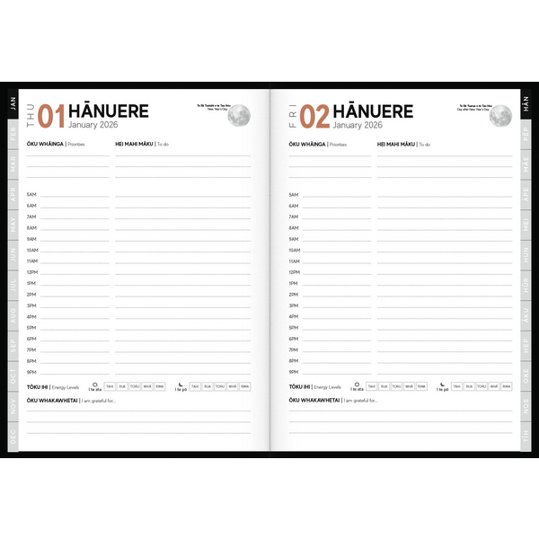 This Tuhi B51 Bilingual Diary is a great way to stay organised and keep track of your important appointments and information. The diary has a day per page layout, which is ideal for those who need plenty of space to plan out their day in detail. There is also space for weekly reflections and goal planning. The diary includes plenty of M ori content such as significant date and public holidays, karakia, korero, ko wai au and waiata to use as well as layouts for Matariki and Maramataka.