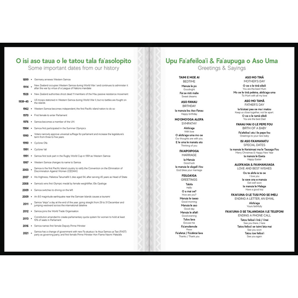 This Tuhi B51 Bilingual O Aso Ma Ona Fuafuaga Diary is an ideal way to keep track of appointments and help you stay organised. It has a day per page layout with plenty of space for notes, meetings and tasks. This layout is perfect for those who need to plan out each day in full with plenty of detail. The diary has space for weekly reflections and goal setting and contains plenty of Samoan content to help bring Samoan language and culture into your everyday life and into your workspace. The diary includes Samoan history, significant dates, prayers, songs, greetings, sayings and proverbs.