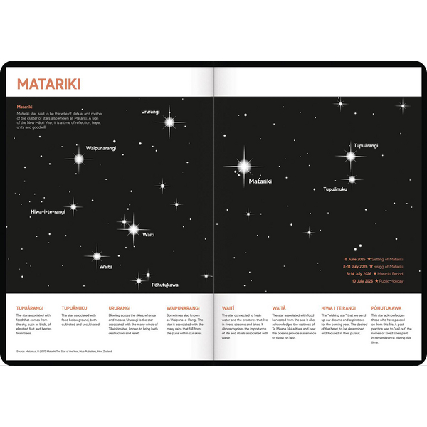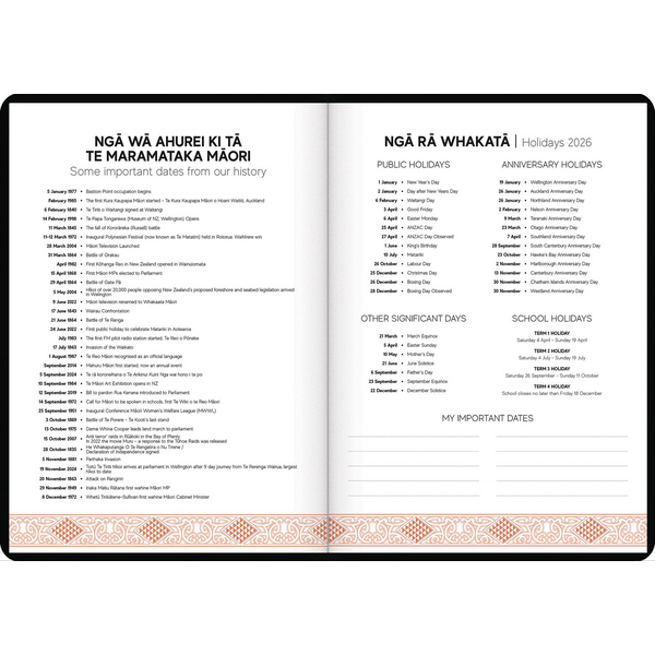 This Tuhi B53 Bilingual Premium Bilingual Mahere Wiki is a great way to stay organised and keep track of your important appointments and information. The diary has a week to view layout (m here a wiki) which is great for those who like to be able to see and plan their entire week at-a-glance. It has plenty of space for notes and includes sections for goal planning and weekly reflection. The diary is a great way to incorporate M ori language in your day and your workplace. It includes significant M ori dates, public holidays, karakia, korero, ko wai au and waiata to use and also has special Matariki and Maramataka layouts.