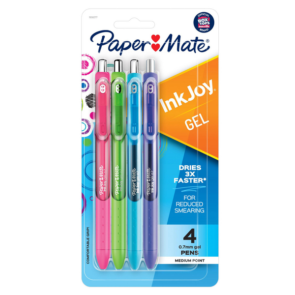 The Paper Mate InkJoy Fashion Assorted Gel Pens feature a pack of four 0.7mm pens in the colours pink, green, blue and purple. The vivid gel ink is fast drying for less smearing. The pens are fully wrapped with an ergonomic grip to ensure comfort when writing, and help to prevent fatigue after continuous use. The medium tip ensures writing is smooth and fluid, making these pens ideal for the workplace, home, or schools.