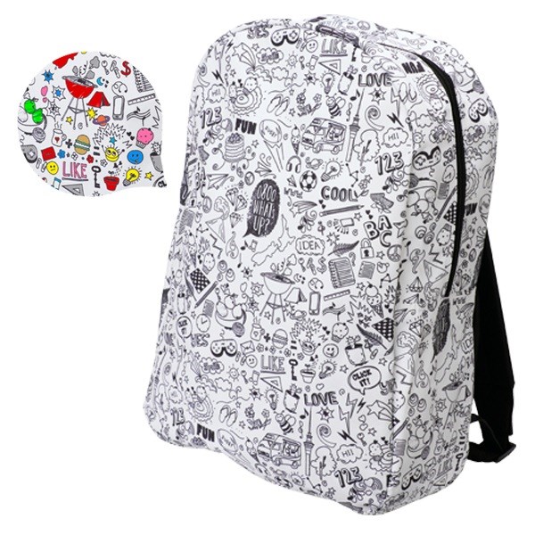 Create your own one of kind' bag with this 0800 What's Up Colour Me In Bag. This bag has designs to colour in so every one will be unique. Ideal for kids, and perfect for library books or sports gear.